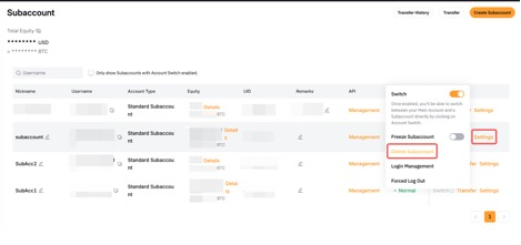 لهذا الإجراء، ستحتاج إلى الذهاب إلى صفحة الحساب الفرعي عبر حسابك الرئيسي. ثم، انقر على زر الإعدادات للحساب الفرعي القياسي المعني واضغط على أيقونة إلغاء الربط في نافذة إدارة تسجيل الدخول المنبثقة. لمزيد من التفاصيل، يرجى الرجوع إلى هذه المقالة.