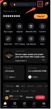 الخطوة 2: قم بفتح تطبيق Bybit واضغط على أيقونة ماسح رمز QR في الزاوية العلوية اليمنى. يرجى التأكد من أنك قد قمت بتسجيل الدخول إلى تطبيق Bybit الخاص بك.
