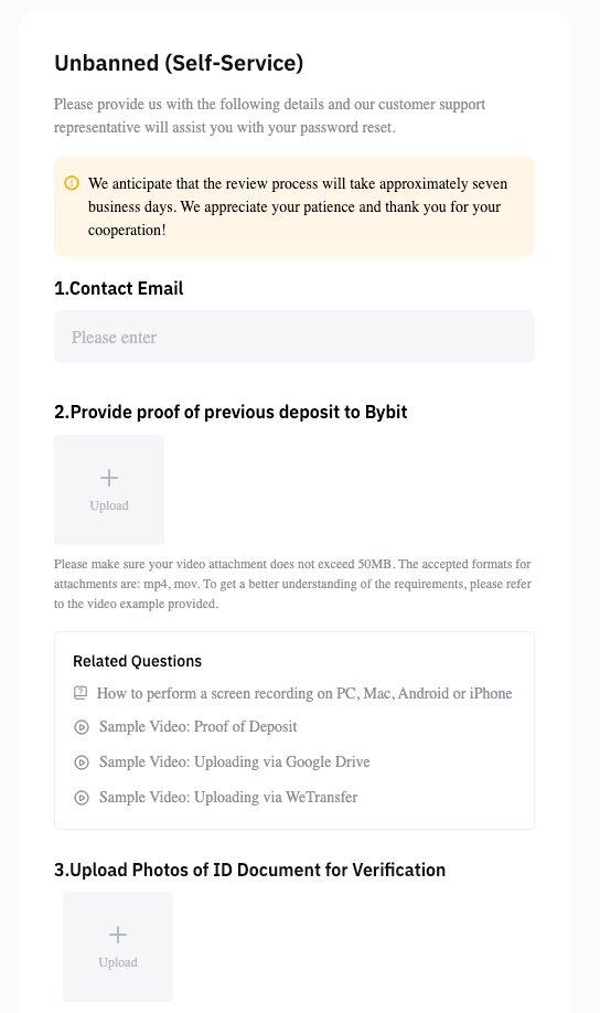 الخطوة 4: في صفحة إلغاء الحظر بالخدمة الذاتية، قد يُطلب منك تقديم التفاصيل التالية لفريق دعم العملاء لدينا لمراجعة طلب إلغاء الحظر ومعالجته. قد تختلف المستندات المطلوبة باختلاف حالة الحساب. ستستغرق العملية حوالي 5-7 أيام عمل.