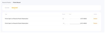 انقر على أيقونة السجلات في صفحة سوق المكافآت. يمكنك عرض النقاط المكتسبة والمخصومة عن طريق التبديل بين العلامات التبويب على صفحة سجل النقاط.