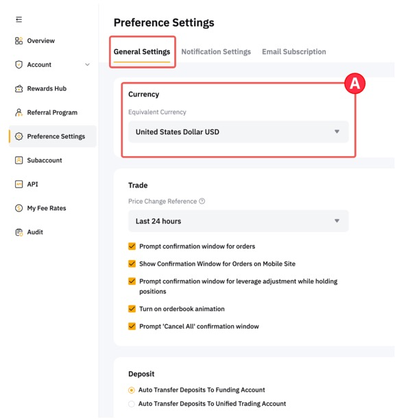 اختر العملة التي تفضلها لعرضها على موقع Bybit الإلكتروني في تبويب الإعدادات العامة . ستُستخدم هذه العملة لتقدير رصيدك ومبالغ طلباتك، مما يُساعدك على فهم قيمة حسابك بشكل أفضل .