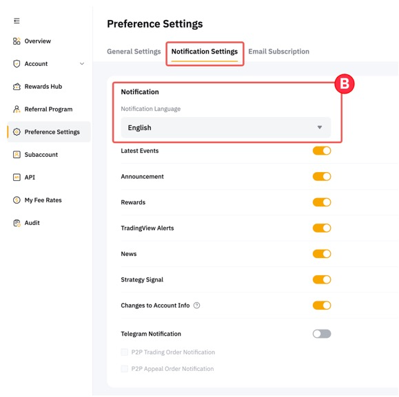 اختر لغة الإشعارات المفضلة لديك من القائمة المنسدلة في تبويب إعدادات الإشعارات . يُرجى العلم أن هذا الإعداد ينطبق فقط على إشعارات البريد الإلكتروني التي تتلقاها. لتغيير لغة إشعارات الموقع الإلكتروني أو الإشعارات المنبثقة، يُرجى الرجوع إلى هذا الدليل .