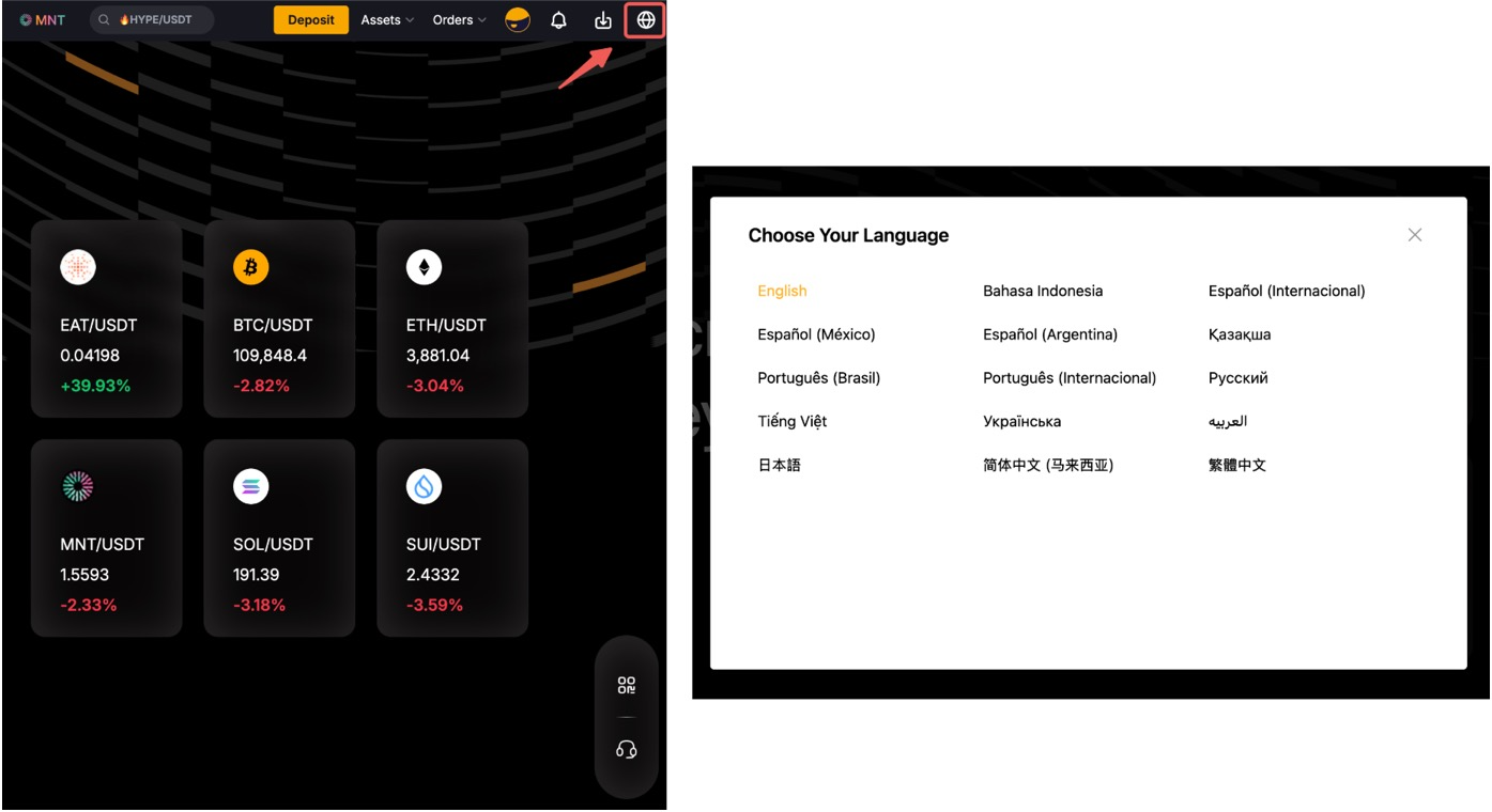 في الزاوية العلوية اليمنى من الموقع الإلكتروني، انقر على أيقونة الكرة الأرضية لفتح قائمة اللغات المتاحة واختيار لغتك المفضلة.