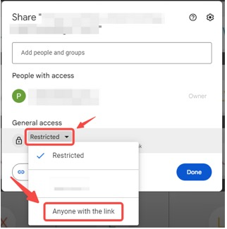 الخطوة 4: انقر على مقيد. في القائمة المنسدلة، اختر أي شخص لديه الرابط وتأكد من أنه في وضع العرض فقط.