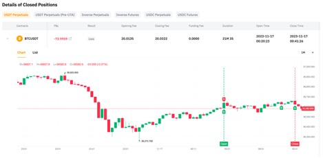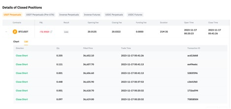 في تبويب القائمة ، يمكنك الوصول إلى جميع التداولات المرتبطة بالمركز. يعرض هذا التبويب بشكل حصري المراكز المغلقة تمامًا. بالنسبة لتفاصيل الطلبات المتعلقة بالمراكز المغلقة جزئيًا، يمكنك الرجوع إلى تفاصيل الطلبات المغلقة تحت أداء التداول.