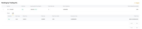 في تبويب التصنيف حسب حجم التداول ، يمكنك توسيع كل رمز لعرض الرسم البياني الذي يظهر نقاط الشراء والبيع الخاصة بك ضمن الإطار الزمني المحدد. بالإضافة إلى ذلك، يمكنك أيضاً اختيار الفاصل الزمني للرسم البياني في الزاوية اليمنى العليا وضبط حجم الرسم البياني.
