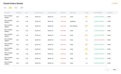 في علامة التبويب تفاصيل الأوامر المغلقة، يمكنك اختيار الكل لعرض جميع الأوامر المغلقة. بدلاً من ذلك، يمكنك الوصول إلى معلومات شاملة عن الطلبات لعقود معينة، بما في ذلك اسم العقد، الكمية المملوءة، متوسط سعر الدخول، متوسط سعر الإغلاق، نوع التنفيذ، وأكثر.