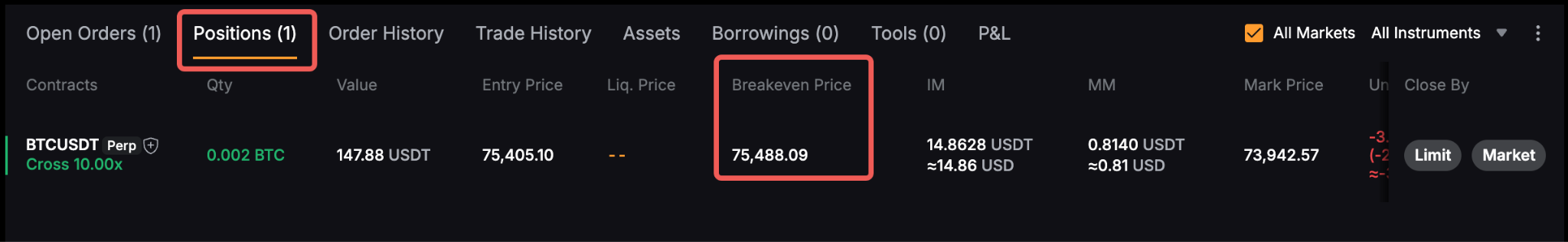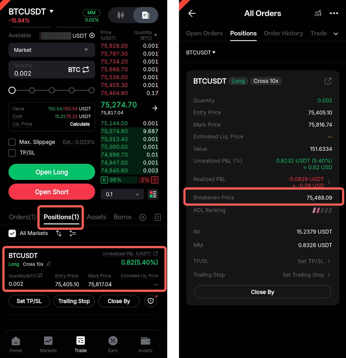 The breakeven price is the price at which you can close your position without incurring a net loss, after accounting for all trading fees (both opening and closing).