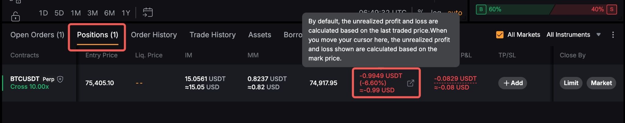 By default, the unrealized P&L is calculated based on the last traded price (LTP). You can hover over the Unrealized P&L field to view the value calculated using the Mark Price, which serves as the system's fair price reference for liquidation.