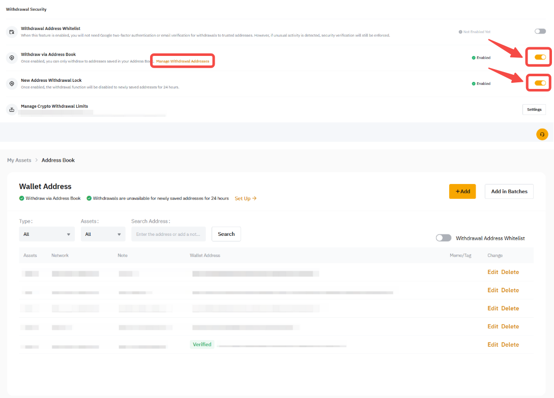 Enabling the New Address Withdrawal Lock feature restricts any newly added withdrawal address from being used for a 24-hour period. This provides an additional layer of security and helps prevent unauthorized withdrawals. Please visit here to manage your withdrawal security.