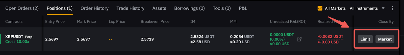 To close a position, go to the Positions tab and you can close by Limit or Market order. If you want to close using other strategies such as a conditional order, you can either utilize our built-in TP/SL function (for Hedge mode) or place it from the order zone in One-way mode.