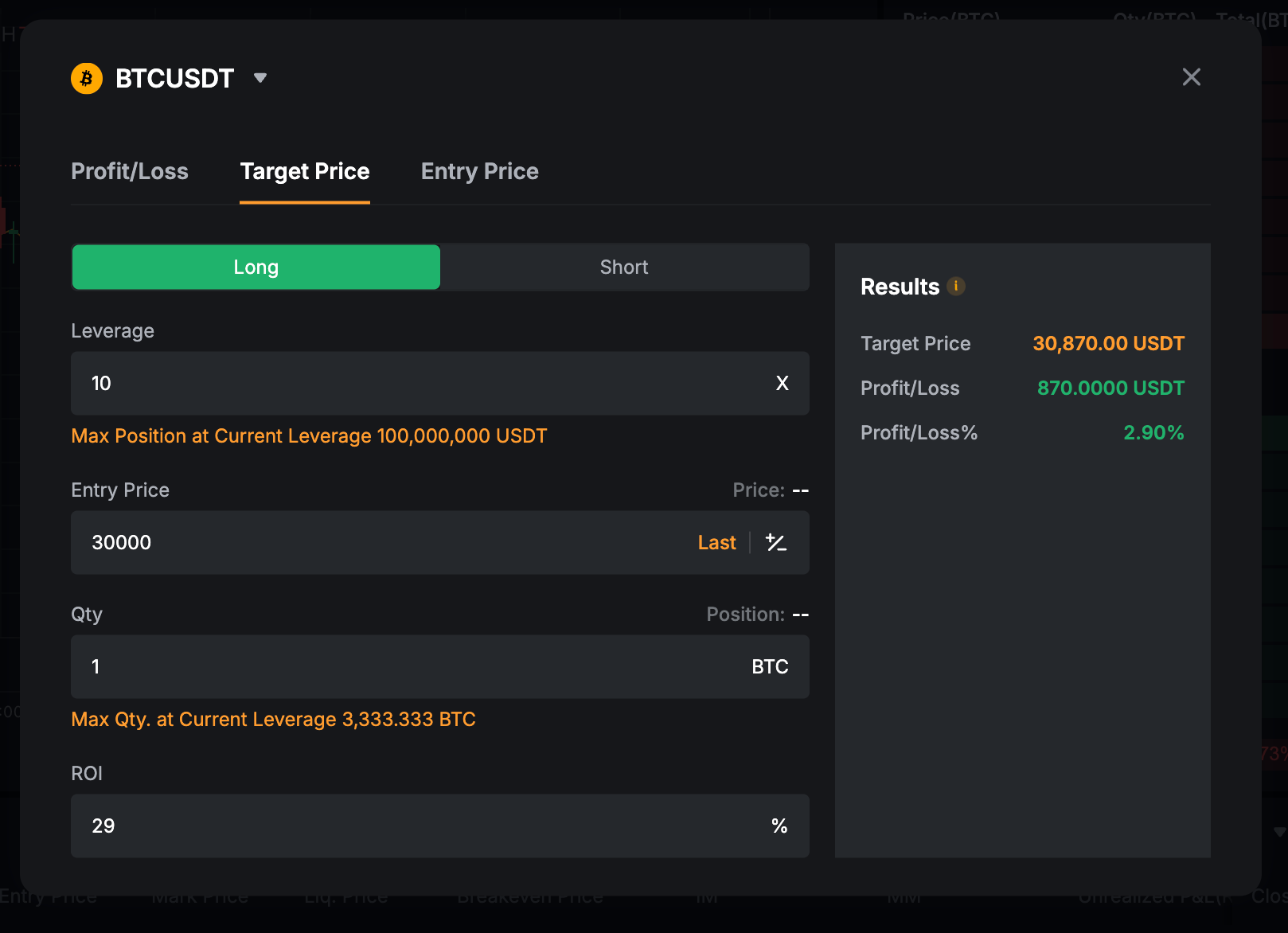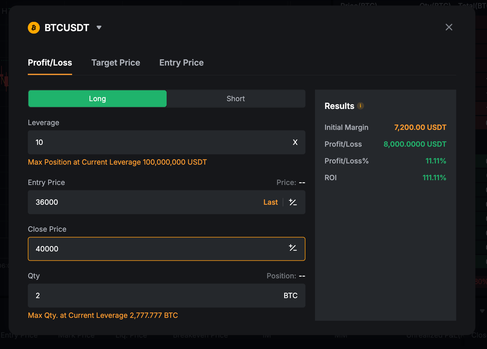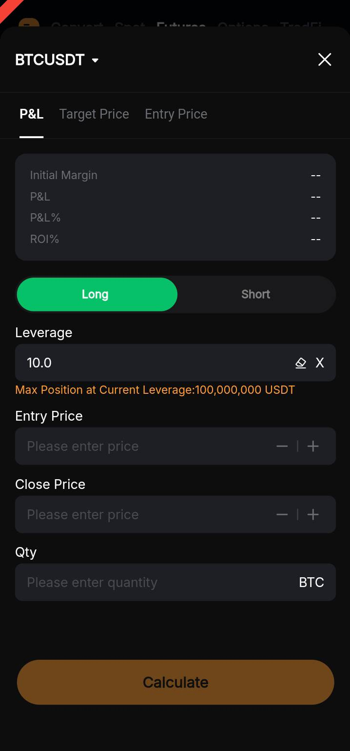 You can calculate the Initial Margin, Profit/Loss, Profit/Loss (%), and ROI (Return of Investment) for your position by entering its Leverage, Contract Quantity, Entry price, and Close price.