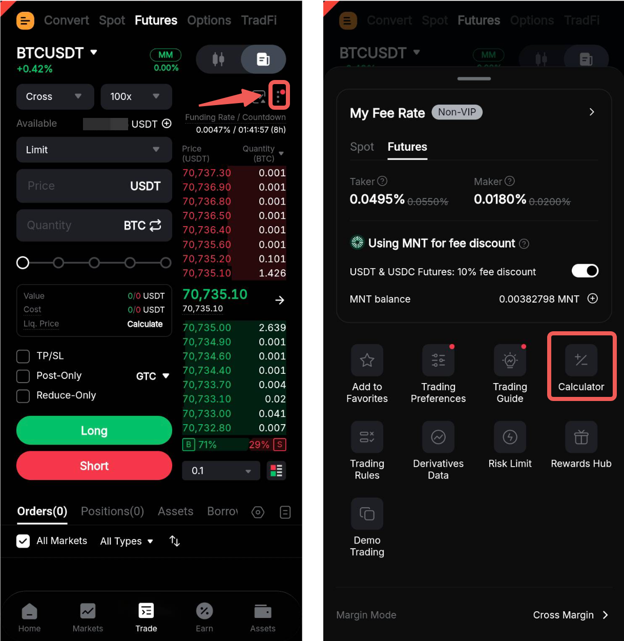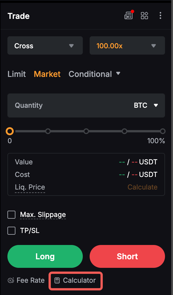 Step 1: On the Web, you can locate the Bybit Calculator at the bottom left of the Order Zone. If you are using the App, go to Trade and tap the Ellipsis icon in the upper right corner to open the trading settings page.