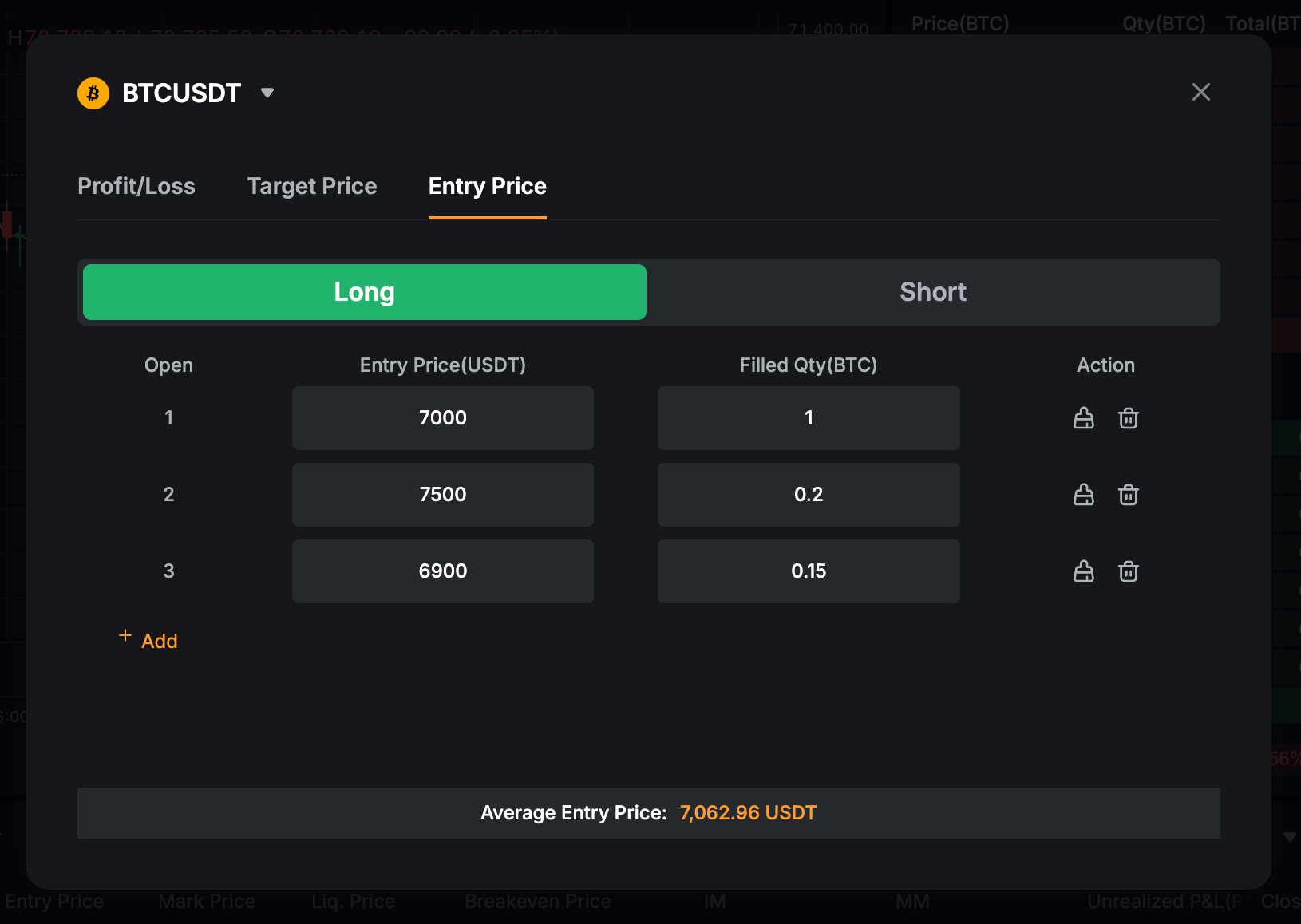 With these calculation tools, you can easily check the Average Entry Price for your positions. This capability empowers you to make more informed estimates, particularly in assessing the Profit and Loss for your positions.