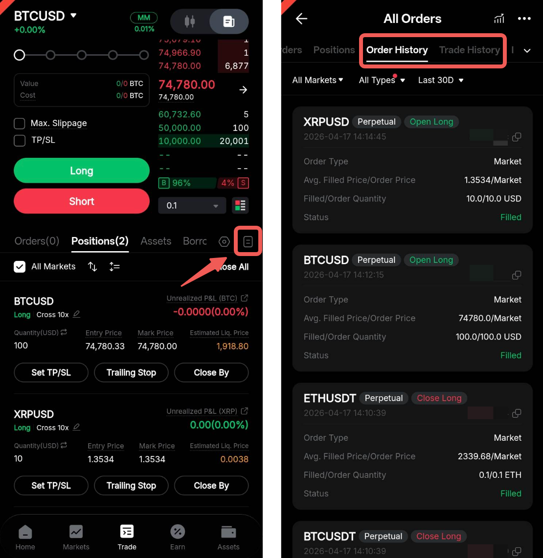 On the Bybit App, tap the history icon below the order book to access your Order History and Trade History.