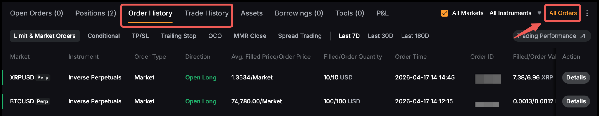 On the website, you can view your trading history in the Order History and Trade History sections below the trading chart. Click All Orders to view the complete records.