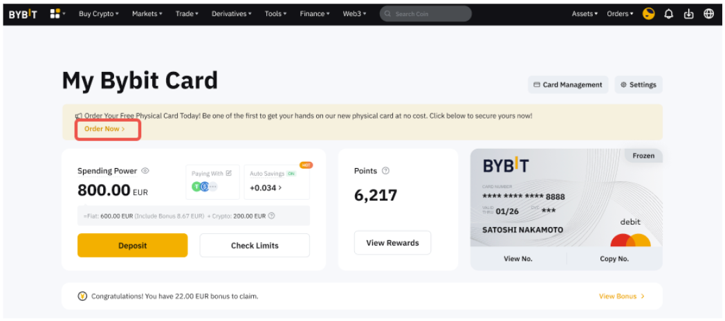 La Tarjeta Bybit es una tarjeta de débito Mastercard que permite un acceso fácil y seguro a tus fondos fiduciarios y digitales para gastar sobre la marcha. Ofrecemos una tarjeta virtual Bybit para que realices pagos en línea, así como una tarjeta física Bybit para que la uses en la tienda o en el cajero automático. Este artículo te guiará sobre cómo solicitar una tarjeta Bybit.