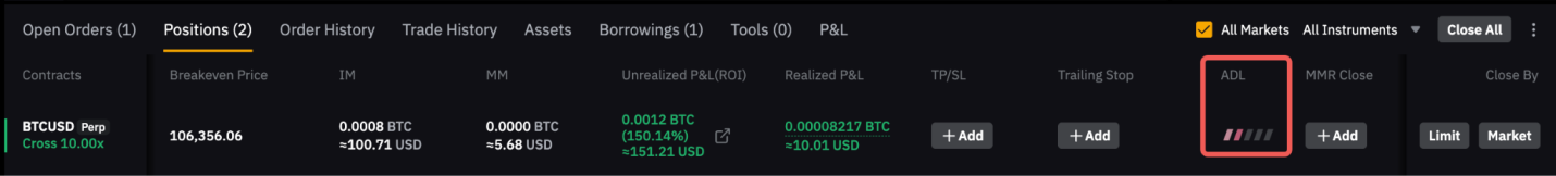 - Pedagang dengan peringkat ADL tertinggi dipilih terlebih dahulu untuk proses deleveraging. Pedagang dapat merujuk pada lampu prioritas ADL pada posisi mereka untuk memperkirakan peringkat ADL mereka.