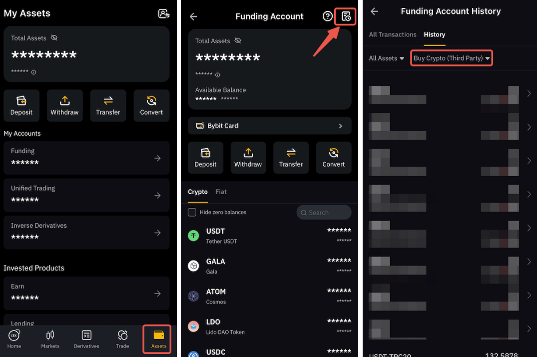 Pada aplikasi, silakan buka tab Aset → Akun Pendanaan, lalu klik Ikon Riwayat pada sudut kanan atas, ketuk Riwayat, dan pilih Buy Crypto (Pihak Ketiga).