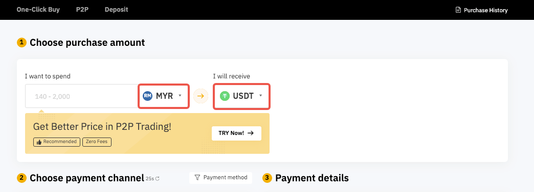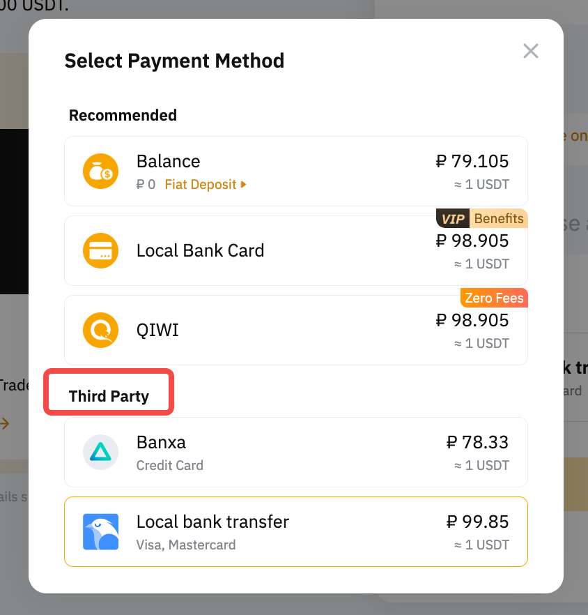 Anda dapat menemukan daftar opsi Fiat dan mata uang kripto yang didukung di laman Beli Sekali Klik, dan menemukan ketersediaan metode pembayaran pihak ketiga. Atau, Anda dapat membuka halaman pesanan Pihak Ketiga dengan mengeklik daftar tarik-turun Fiat atau koin.