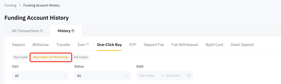 Anda bisa mendapatkan catatan penyetoran dari laman aset Bybit Anda di bawah tab Beli dalam Sekali Klik dengan mengeklik Beli Kripto Melalui Pihak Ketiga.