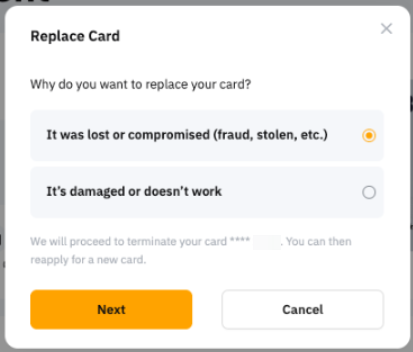 Pilih opsi ini saat Kartu Bybit Anda telah dibobol. Setelah mengonfirmasi opsi, Kartu Bybit fisik Anda akan dihentikan dan Anda dapat mengajukan permohonan kartu baru.
