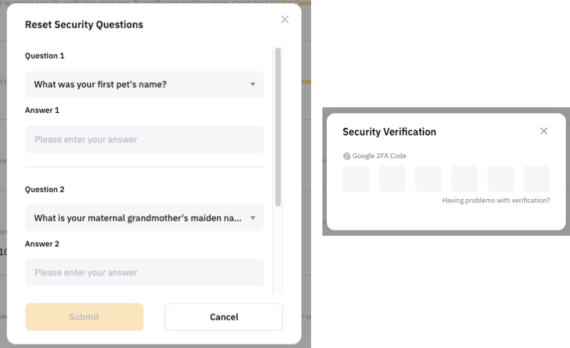 Langkah 3: Pilih tiga (3) pertanyaan keamanan dan kunci jawaban, lalu klik Kirim dan masukkan kode Google Authenticator untuk mengonfirmasi tindakan Anda. Harap diperhatikan bahwa jawaban yang Anda masukkan sensitif terhadap kasus.