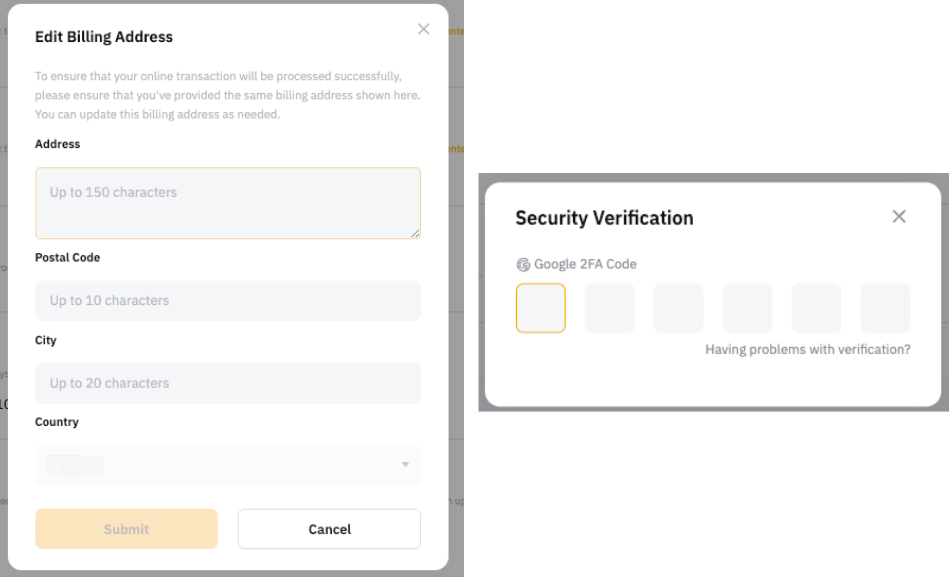 Langkah 3: Isi alamat penagihan Anda yang telah diperbarui, lalu klik Kirim dan masukkan kode Google Authenticator untuk mengonfirmasi tindakan Anda.