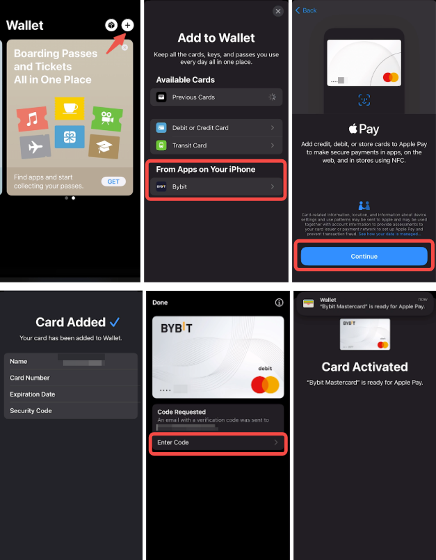 Untuk menambahkan Kartu Bybit ke Apple Pay, cukup temukan Wallet/Watch di perangkat iOS Anda dan klik tombol tambahkan kartu. Kemudian, ikuti petunjuk untuk menambahkan detail Kartu Bybit Anda dan menyelesaikan verifikasi keamanan.