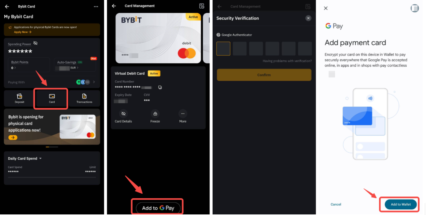 Sebelum melakukannya, pastikan Anda berada di negara atau wilayah yang didukung Google Pay. Cukup buka Aplikasi Bybit Anda dan di halaman Kartu Bybit, ketuk Kartu → Tambahkan ke Google Pay, selesaikan verifikasi keamanan, dan ikuti petunjuk di aplikasi Google Pay Anda.