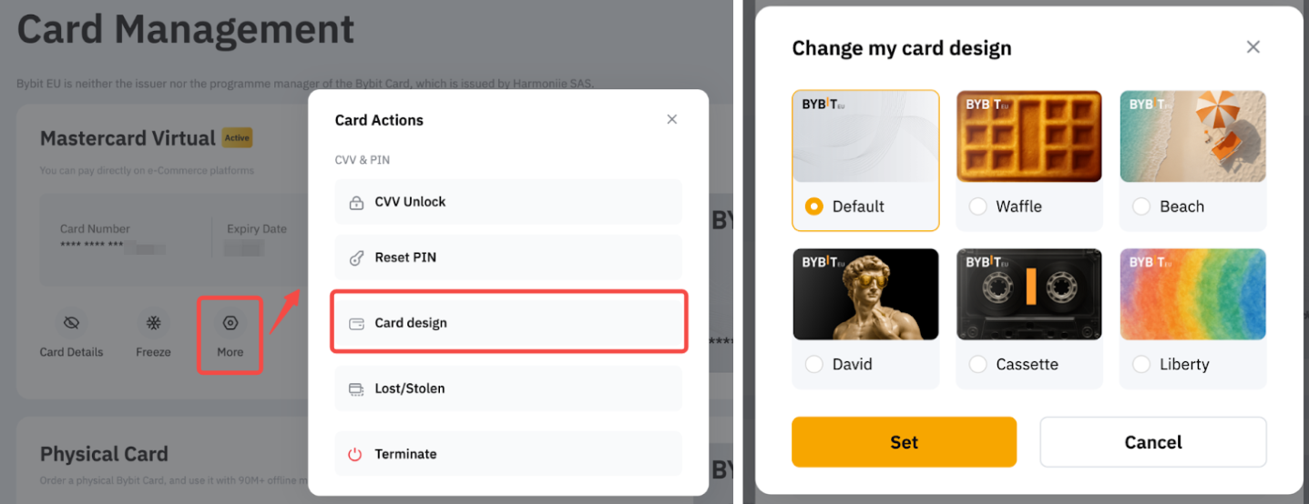 Buka halaman Manajemen Kartu, klik More (Selengkapnya), lalu pilih Desain Kartu. Anda akan diarahkan ke galeri desain kartu virtual yang tersedia. Telusuri pilihan, pilih desain pilihan Anda, lalu klik Set (Tetapkan).