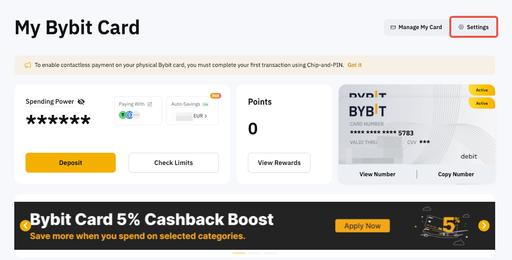 Langkah 1: Buka halaman Kartu Bybit Saya dan klik Pengaturan.