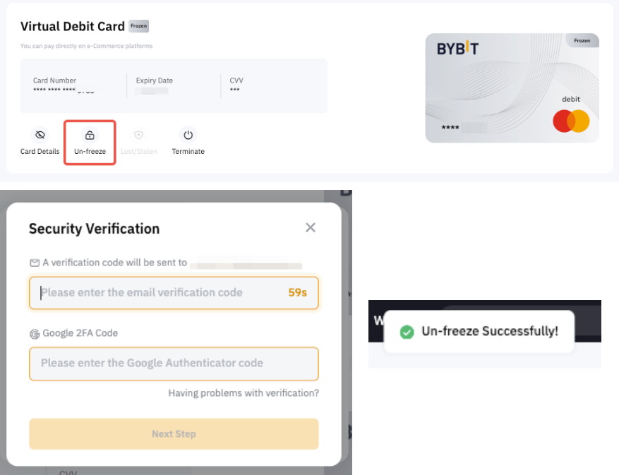 Untuk mengaktifkan kembali Kartu Bybit, klik Batalkan Pembekuan dan selesaikan verifikasi keamanan untuk mengonfirmasi tindakan.