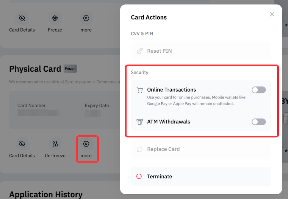 Dengan menonaktifkan opsi ini, transaksi akan diblokir, sehingga memberikan lapisan keamanan tambahan untuk kartu. Untuk alasan keamanan, verifikasi 2FA diperlukan saat mengaktifkan opsi ini, sementara penonaktifannya tidak memerlukan verifikasi 2FA.