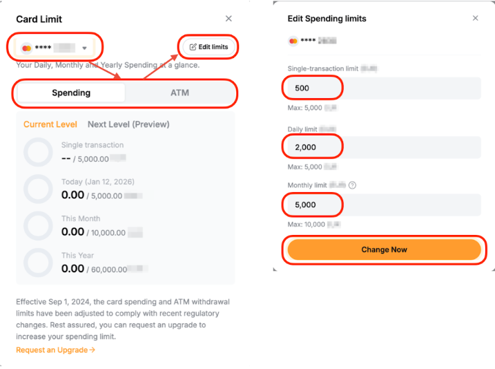 Anda dapat menyesuaikan batas pengeluaran harian/bulanan/tahunan atau batas penarikan ATM anda dalam batas tingkat anda saat ini melalui dasbor Kartu.