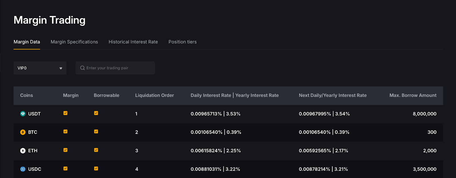 Harap dicatat bahwa tarif bunga bervariasi setiap hari. Selain itu, setiap tingkat VIP akan menikmati tarif bunga harian dan tahunan yang berbeda. Anda dapat merujuk pada tarif bunga harian, tarif bunga tahunan, dan jumlah maksimum yang dapat dipinjam untuk setiap koin di sini.