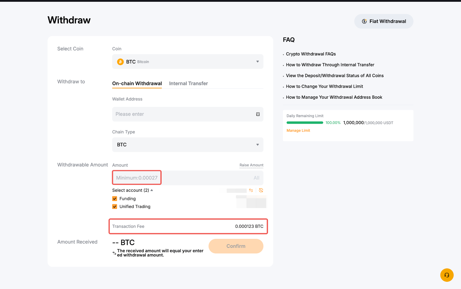 Biaya Penarikan akan dikenakan untuk penarikan on-chain tergantung pada jenis koin dan rantai yang dipilih. Anda dapat melihat jumlah penarikan minimum dan biaya penarikan yang terdapat pada jendela penarikan. Harap dicatat bahwa biaya penarikan sama untuk semua jumlah penarikan.