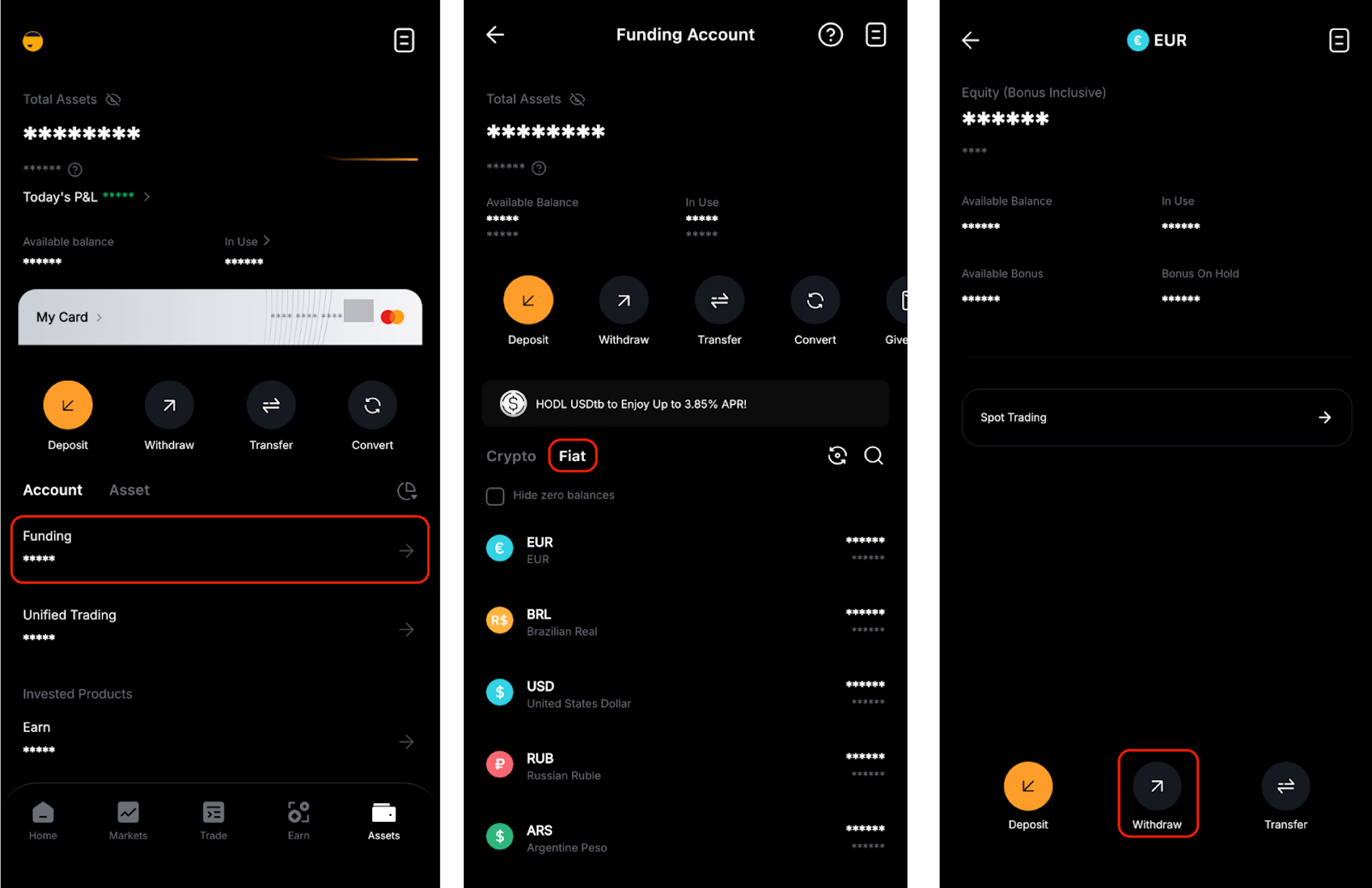 Pada Aplikasi, buka halaman Aset dan ketuk Pendanaan → Fiat. Kemudian, ketuk mata uang Fiat dan lihat biaya terkait untuk setiap metode pembayaran.