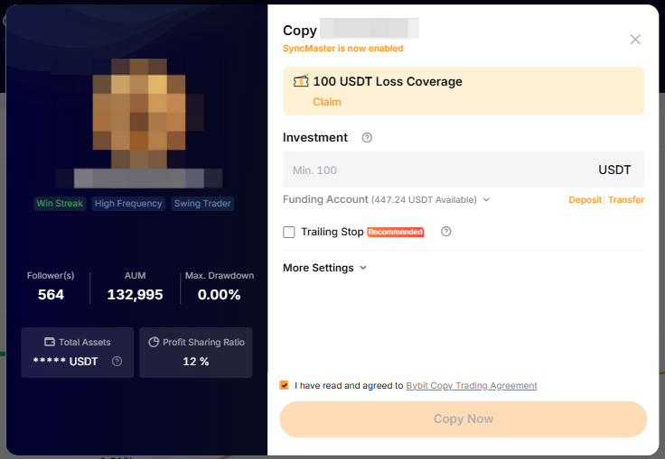 Investasi | Ini adalah jumlah total yang akan Anda investasikan untuk menyalin Master Trader ini. Anda dapat memasukkan jumlah sesuai dengan saldo akun Bybit Anda dan juga memilih saldo akun mana yang akan digunakan, yakni Akun Perdagangan Terpadu atau Akun Pendanaan. Umumnya, dana minimum yang akan disalin adalah 100 USDT. Namun, Master Trader dapat menyarankan atau memaksa pengikutnya untuk menyinkronkan dana minimum yang diperlukan untuk menyalinnya. |
