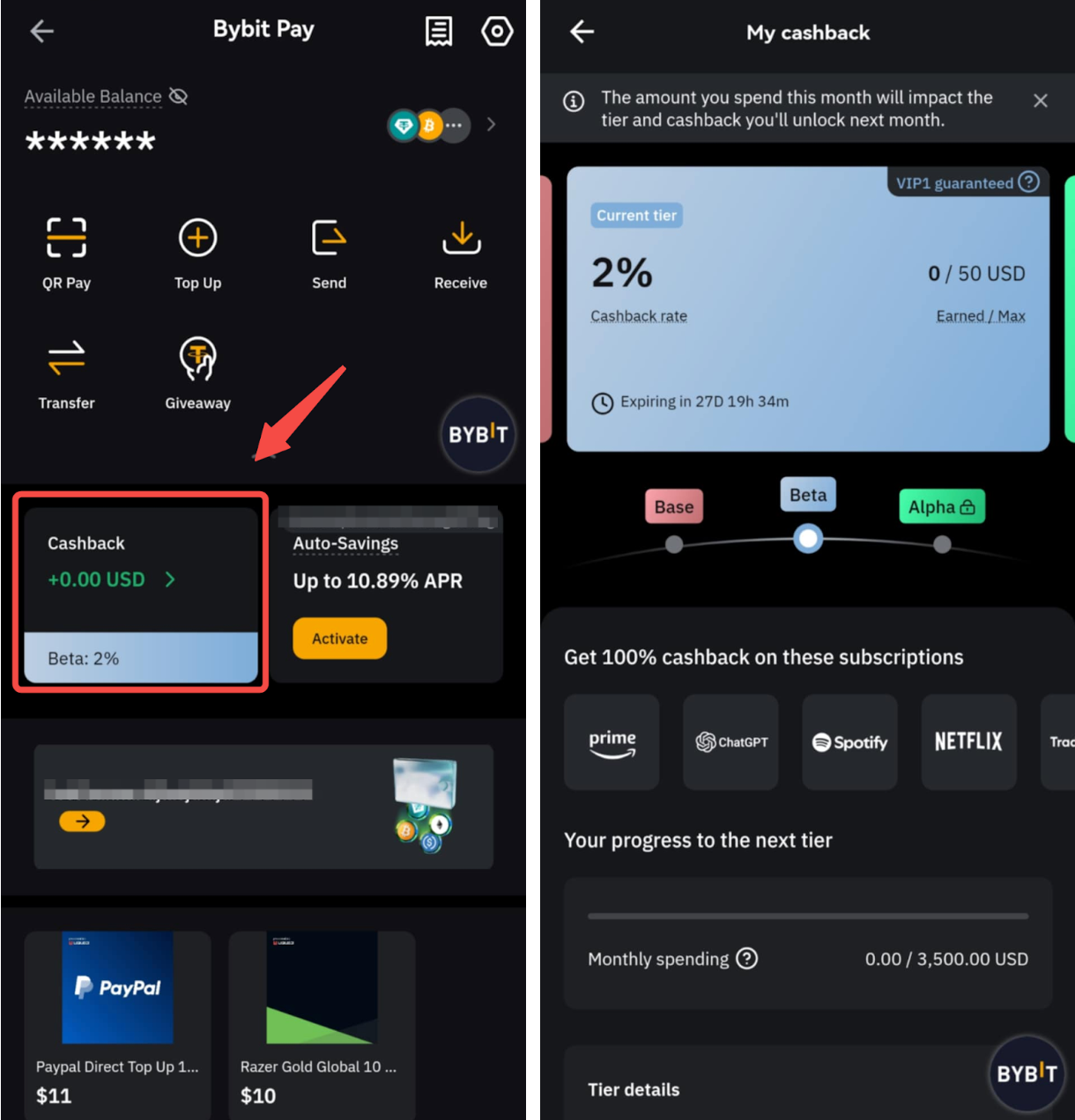 Anda dapat membuka halaman Bybit Pay dan ketuk bagian cashback untuk melihat progresnya. Harap dicatat bahwa penghitungan pengeluaran dan progres akan diatur ulang pada hari pertama setiap bulan kalender.