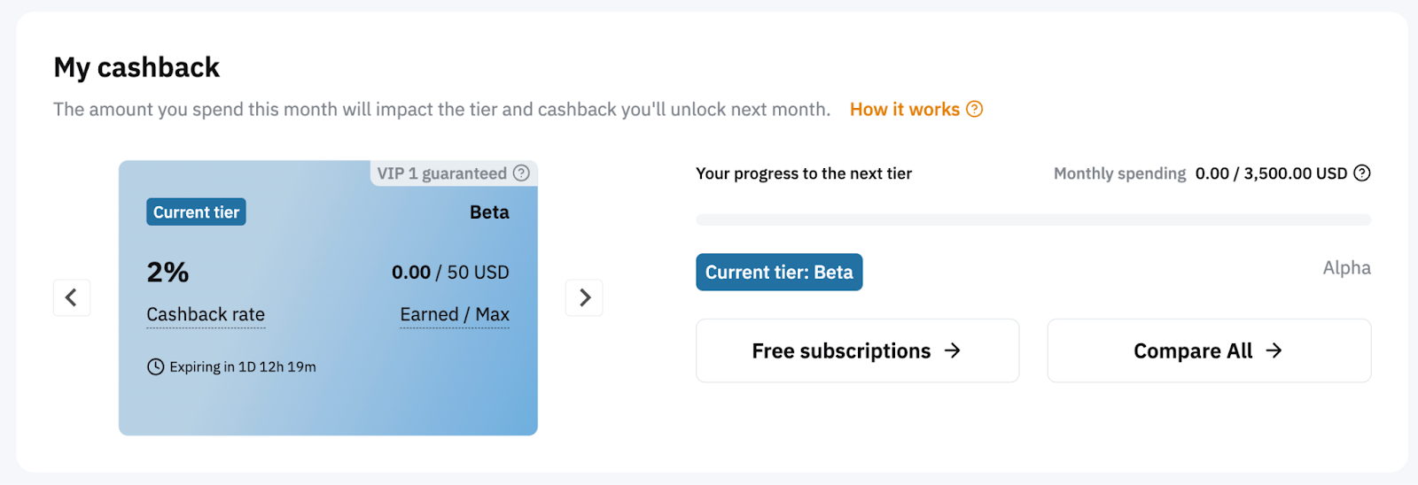 Cashback didistribusikan sebagai poin, yang dapat ditebus secara manual atau otomatis untuk hadiah fiat