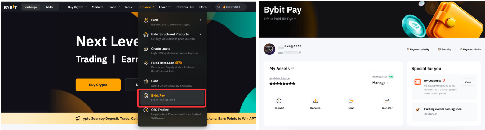 Jika Anda berada di Situs Web Bybit, klik Keuangan dan ketuk Bybit Pay.