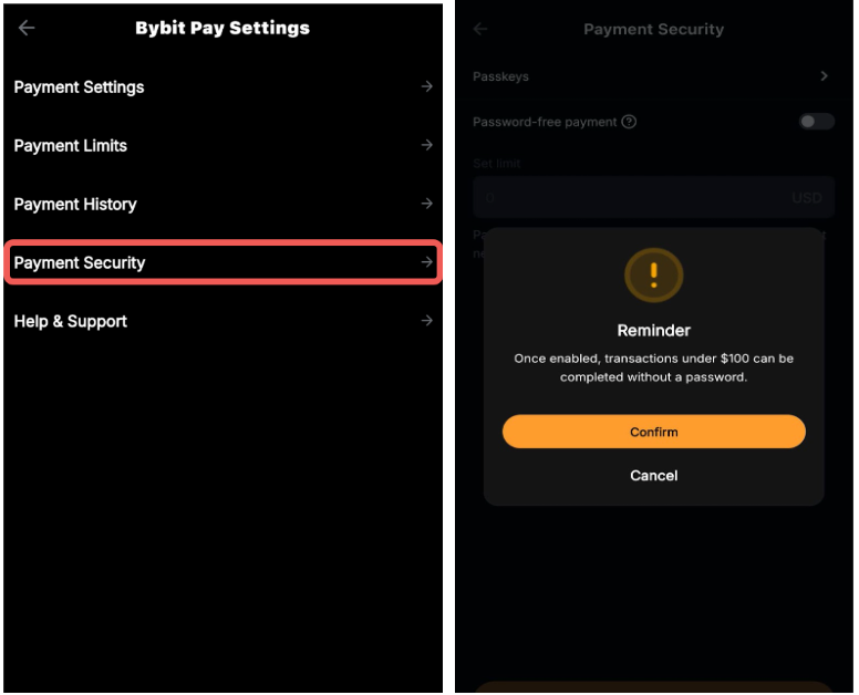Anda dapat mengaktifkan pembayaran Bebas Kata Sandi dari Pengaturan Bybit Pay → Keamanan Pembayaran.