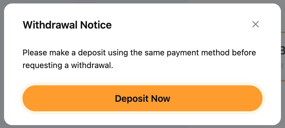 — Untuk mata uang dan metode pembayaran tertentu, Anda hanya dapat menarik dana ke akun yang telah Anda gunakan untuk melakukan deposit menggunakan metode dan mata uang yang sama. Jika ini adalah akun baru, lakukan deposit yang berhasil terlebih dahulu sebelum mencoba melakukan penarikan. Harap pastikan untuk memeriksa persyaratan untuk setiap metode pembayaran sebelum melakukan penarikan fiat.