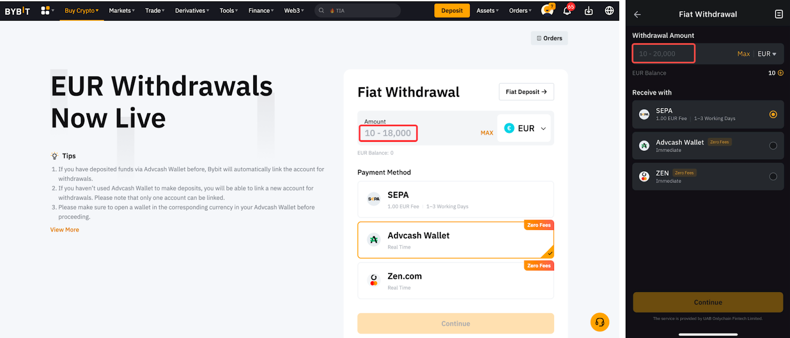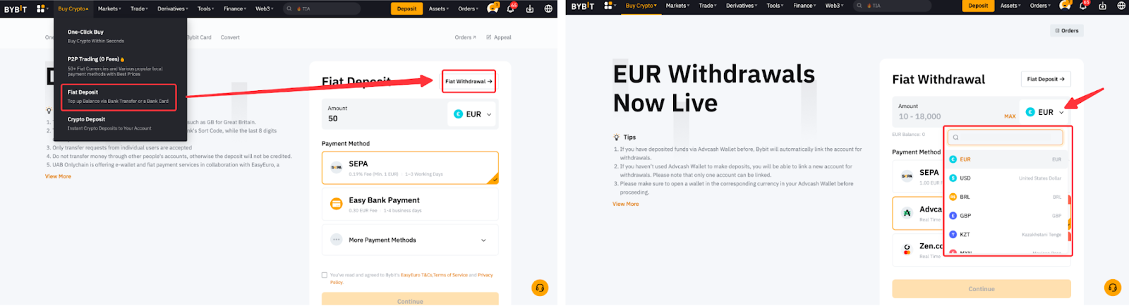 Hanya sejumlah mata uang fiat yang dapat ditarik di Bybit. Anda akan dapat melihat mata uang fiat yang didukung untuk penarikan fiat di laman Penarikan Fiat.
