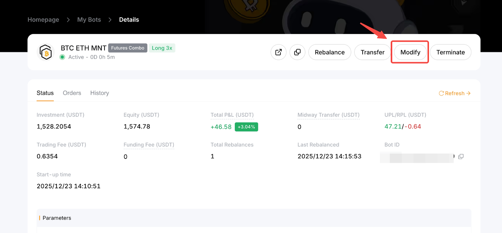 Ya. Anda dapat menyesuaikan parameter Bot Kombo Futures Anda yang sedang berjalan melalui halaman Detail Bot. Untuk memulai, buka Lihat Bot Saya dan temukan bot aktif yang parameternya ingin Anda sesuaikan. Kemudian klik Detail → Ubah.
