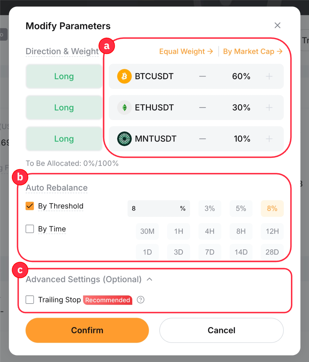 - Atur proporsi kontrak yang Anda pilih secara manual atau dengan memilih opsi preset yang tersedia— berdasarkan berat yang sama atau berdasarkan kapitalisasi pasar.