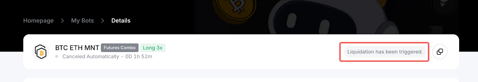 Harap dicatat bahwa sistem akan secara otomatis menghentikan bot dan Anda akan melihat pesan status likuidasi di pojok kanan atas pada detail bot.