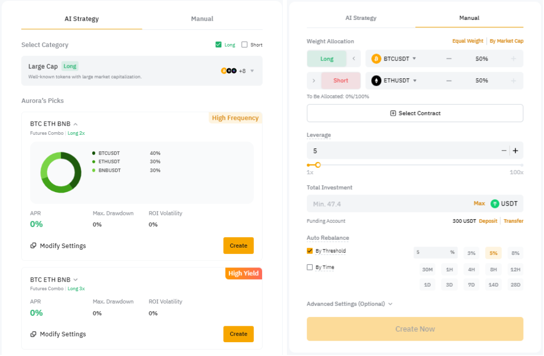 Bot Kombo Futures memungkinkan pengguna untuk membuat dan mengelola portofolio kontrak dengan minimal dua (2) dan hingga 10 kontrak. Anda dapat menyesuaikan portofolio dengan mengatur parameter, termasuk kontrak, arah posisi, proporsi posisi (akurat hingga 1%), leverage, dan mekanisme penyeimbangan kembali (ambang batas proporsional dan/atau interval waktu). Selain itu, pesanan dapat dibuat menggunakan strategi AI untuk keputusan trading yang optimal.
