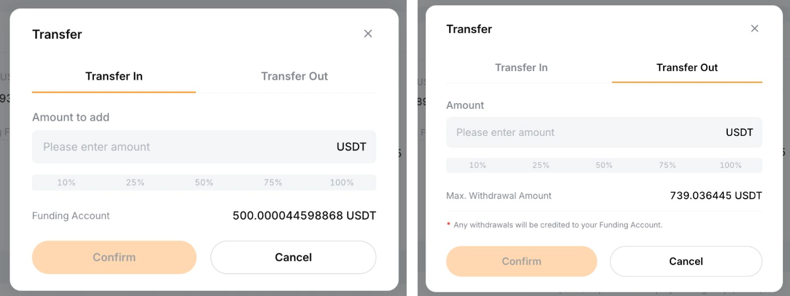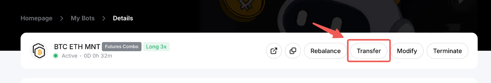 Ya, Anda dapat menambah atau menarik dana dari Bot Kombo Futures Anda yang aktif dengan menekan tombol Transfer pada halaman Detail Bot. Cukup beralih ke tab yang sesuai dan atur detail jumlah melalui bidang input atau bilah persentase sebelum menekan Konfirmasi.